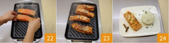 À ce stade, chauffez très bien le gril sur le feu, puis faites cuire les filets de saumon en les retournant de chaque côté pendant environ 1 à 1 minute et demie 22, de manière à ce qu'ils restent croustillants à l'extérieur et tendres et roses à l'intérieur. Une fois prêts 23, placez les tranches de saumon sur un plat de service et dressez le riz pilaf à l'aide d'un emporte-pièce de 8 cm; enfin, vous pouvez servir et déguster le saumon glacé au miel 24.
