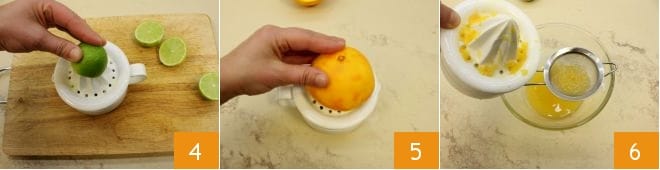 Passez ensuite à la préparation de la marinade : pressez le citron vert 4 et l'orange 5 puis filtrez le jus des deux avec une passoire 6.