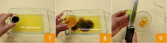 Dans un grand plat peu profond, versez le jus des agrumes, la sauce soja 7, le miel 9 et l'huile. Râpez le zeste du citron vert et de l'orange 9
