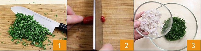 Pour réaliser le saumon grillé avec sauce au persil, commencez par la sauce au persil que vous pouvez préparer quelques heures à l'avance si vous le souhaitez. Hachez finement avec un couteau (ou si vous préférez, mixez dans un hachoir) le persil 1 et l'échalote, coupez en petits morceaux le piment frais 2. Dans un bol, placez le persil haché, l'échalote hachée