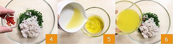 et le piment en morceaux. Mettez de côté le mélange haché. Occupez-vous maintenant de la sauce pour l'assaisonnement : dans un petit bol, versez l'huile, le jus de citron 5 et deux cuillères à soupe de vinaigre de cidre. Émulsionnez bien la sauce et incorporez-la au mélange préparé précédemment 6,