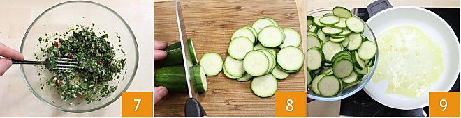 mélangez bien pour que le mélange absorbe l’assaisonnement 7, ajustez de sel et de poivre. Mettez de côté la sauce et occupez-vous de l'accompagnement de courgettes : lavez et coupez les courgettes en rondelles 8. Placez dans une large poêle l'ail haché (ou si vous préférez, vous pouvez le laisser entier et l'enlever après qu'il ait parfumé l'huile) et quatre cuillères à soupe d'huile, laissez fondre et ajoutez les courgettes, salez, poivrez