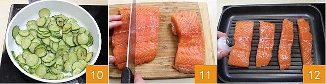 (vous pouvez consulter le procédé dans la recette des Courgettes sautées) et cuisez à feu vif, en couvrant la poêle avec un couvercle jusqu'à ce que les courgettes soient cuites 10. Enfin, préparez le saumon : prenez le filet de saumon nettoyé et coupez-le en 4 tranches d'environ 200 g chacune 11. (vous pouvez alternativement acheter chez le poissonnier 4 tranches déjà coupées). Chauffez une poêle en fonte, une fois qu'elle est bien chaude, placez les tranches, salez 12,