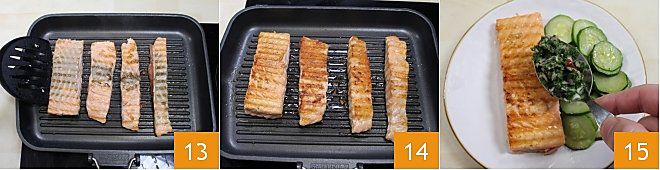 poivrez et cuisez environ 3-4 minutes de chaque côté 13. Les tranches seront prêtes lorsque la surface sera bien dorée 14. Maintenant, vous pouvez dresser le plat 15 : arrosez le saumon avec la sauce au persil préparée précédemment et ajoutez les courgettes sautées. Servez le saumon grillé avec sauce au persil bien chaud.