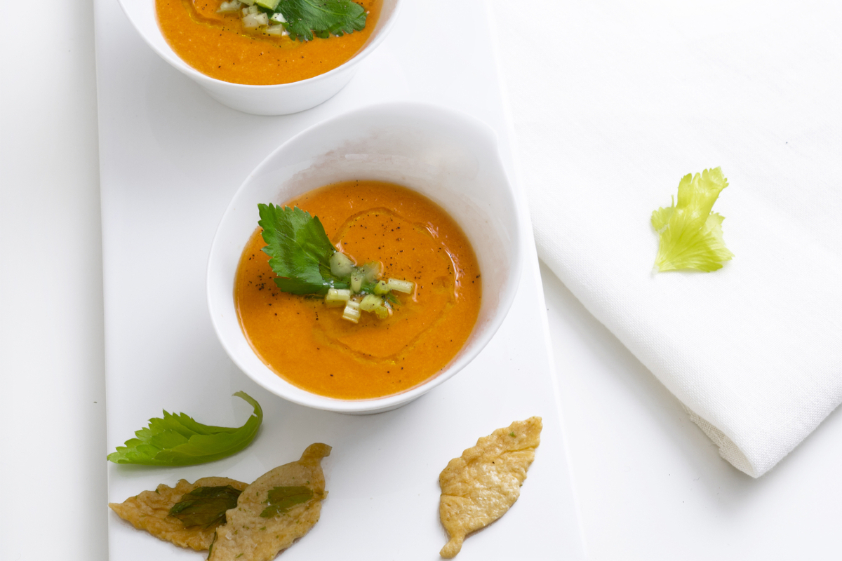 Le Salmorejo avec crackers au céleri est une entrée savoureuse à la manière andalouse !