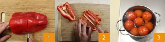 Pour réaliser la sauce rubra, lavez le poivron, éliminez le pédoncule, divisez-le en deux 1 et retirez les petites graines à l'intérieur puis coupez-le d'abord en lanières 2 puis en dés et mettez-le de côté. Lavez puis ébouillantez les tomates 3.