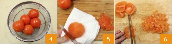 Égouttez-les 4, pelez-les 5, retirez les graines internes et coupez-les en dés 6.