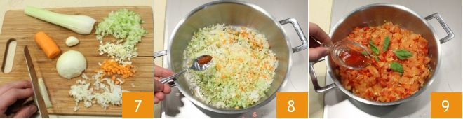 Préparez maintenant le soffritto : lavez le céleri, éliminez les filaments les plus extérieurs et hachez-le, lavez, pelez et hachez la carotte et enfin, pelez et hachez également l'oignon. Pour réaliser au mieux le soffritto, suivez l'école de cuisine Comment faire le soffritto 7. Versez le hachis dans une grande poêle, aromatisez avec le piment 8 et faites revenir avec 4 cuillères à soupe d'huile à feu doux pendant environ 10 minutes, jusqu'à ce qu'ils dorent,