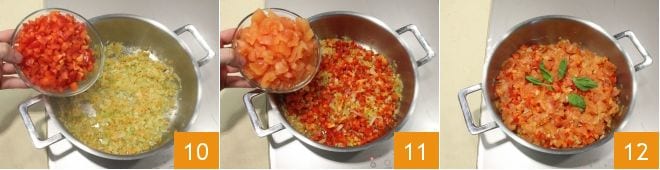 puis ajoutez les poivrons en prenant soin d'en garder une poignée pour garnir la sauce 9, les tomates 10, les feuilles de basilic 11, le vinaigre 12,