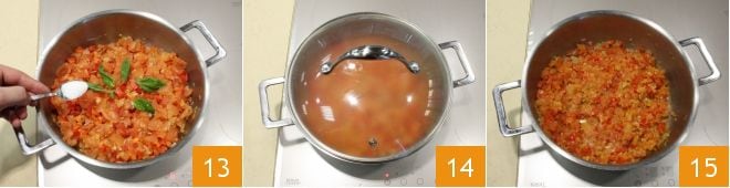 le sucre 13 et le sel. Faites cuire à feu doux avec le couvercle 14 jusqu'à ce que la consistance de la sauce soit bien épaisse 15,