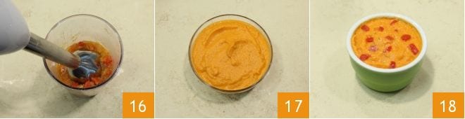 puis mixez avec un mixeur plongeant 16 ou passez le tout au moulin à légumes. Mélangez bien la sauce en ajoutant deux cuillères à soupe d'huile, ajustez de sel 17 et servez la sauce rubra en la garnissant avec les dés de poivron que vous avez mis de côté 18.