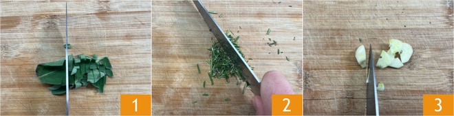 Pour préparer les saucisses à la friteuse à air, commencez par hacher finement la sauge 1, le romarin 2, le thym et l'ail 3 au couteau.