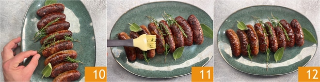 Dressez-les, décorez avec des herbes aromatiques 10 et badigeonnez avec l'autre huile aromatique 11. Vos saucisses à la friteuse à air sont prêtes à être servies bien chaudes 12.