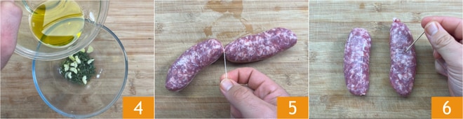 Rassemblez le tout dans un petit bol, ajoutez l'huile 4 et laissez infuser pendant 10 minutes. Pendant ce temps, retirez le fil 5 et séparez les saucisses. Piquez-les avec un cure-dent 6, afin que tous les liquides en excès soient éliminés pendant la cuisson.