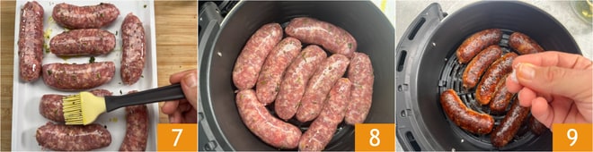 Disposez les saucisses sur un plateau et badigeonnez-les bien avec l'huile aromatisée 7. Placez-les dans le panier de la friteuse à air (nous avons utilisé une friteuse d'une capacité de 6 litres) 8 et faites cuire à 200° pendant 20 minutes, en les retournant à mi-cuisson, jusqu'à ce qu'elles soient dorées. En fin de cuisson, assaisonnez avec du sel 9.