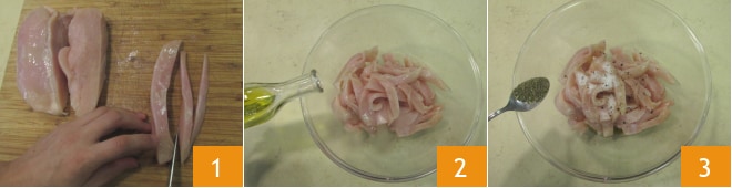 Pour réaliser le sandwich au poulet épicé et betterave, commencez par nettoyer le blanc de poulet en enlevant le cartilage et les petits os, puis coupez-le en lanières de l'épaisseur d'un demi-centimètre 1. Transférez le poulet dans un bol et assaisonnez avec l'huile 2, le sel et l'origan 3.