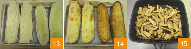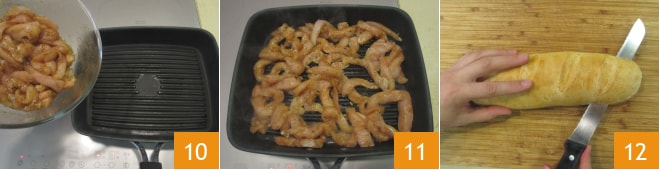 Passez à la cuisson du poulet : chauffez bien une grille, ajoutez les lanières de poulet 10 et faites cuire environ 6 minutes, en les retournant souvent 11. Le poulet doit être bien cuit donc si nécessaire vous pouvez prolonger le temps de cuisson. Pendant ce temps, coupez les pains en deux dans le sens de la longueur 12.