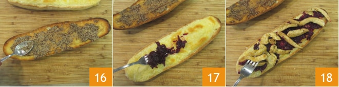 Étalez la moutarde en grains sur les tranches de pain sans fromage 16. Garnissez les autres tranches de pain avec la betterave assaisonnée 17 et le poulet épicé 18.