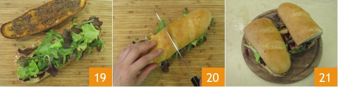 Ajoutez une poignée de salade mixte 19 et refermez les sandwichs, puis coupez-les en deux 20. Vos sandwichs à la betterave et au poulet épicé sont prêts à être dégustés 21 !