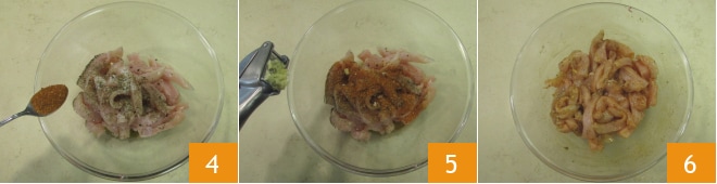 Ajoutez également le paprika 4, le poivre et la gousse d'ail écrasée 5, puis mélangez bien 6, couvrez avec du film plastique et mettez de côté temporairement.