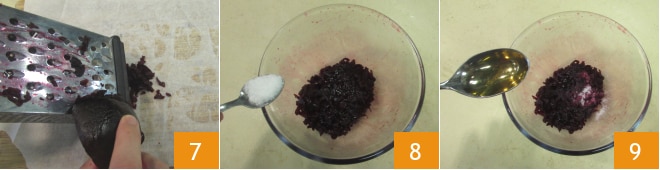 Râpez la betterave précuite avec une râpe à gros trous 7, transférez-la dans un bol et assaisonnez avec le sel 8, l'huile et le vinaigre 9. Mélangez bien et mettez de côté.