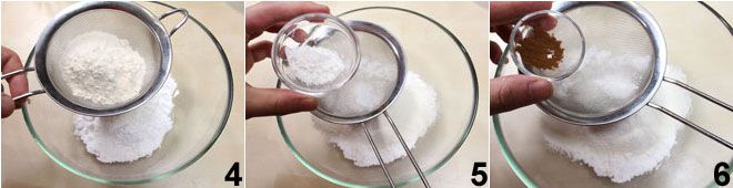 Dans un bol, tamisez ensemble la farine et le sucre glace 4, ajoutez la fécule de maïs 5 et la cannelle 6.