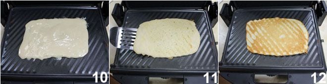 et aplatissez la pâte sur la plaque avec le dos de la cuillère, en laissant une épaisseur de quelques millimètres 10. Fermez la plaque et vérifiez la cuisson : lorsque la pâte est dorée dans la partie inférieure, retournez-la pour dorer également l'autre côté (11-12).