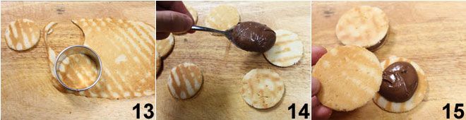 Retirez la pâte cuite, transférez-la sur une planche à découper et encore chaude (pour éviter qu'elle ne durcisse trop et ne se casse), découpez à l'aide d'un emporte-pièce des disques et mettez-les de côté 13. Terminez ainsi toute la pâte et à la fin, assemblez les gaufres. Répartissez sur un disque une cuillerée de Nutella 14 et posez un autre disque par-dessus 15. Voici vos sandwichs gaufres à la Nutella prêts à être dégustés!