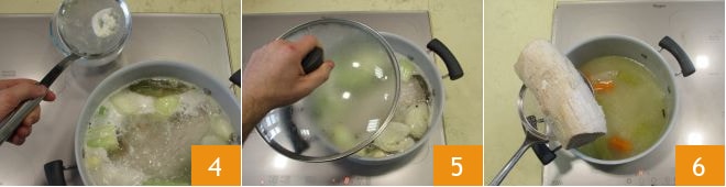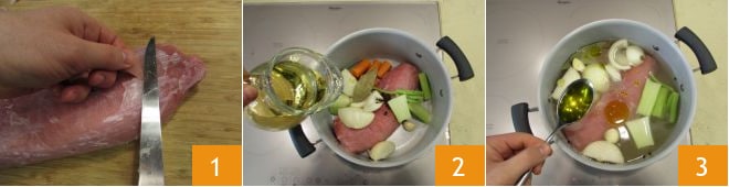 Pour préparer les sandwichs de panettone, il vous faut de la viande déjà cuite. Nous avons utilisé le rosbif du veau à la sauce tonnato. Si vous voulez le préparer spécialement, il suffit de nettoyer la viande des cartilages et des filaments 1, puis de la mettre dans une casserole avec les légumes nettoyés et coupés. Ajoutez du laurier, des clous de girofle et des grains de poivre noir. Versez le vin 2, l'eau, le sel et l'huile et mettez sur le feu 3.