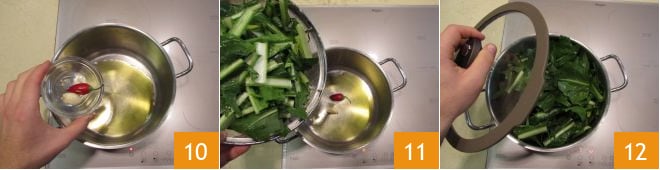 Dans une grande casserole, mettez un filet d'huile, ajoutez l'ail et le piment et chauffez à feu vif 10. Ensuite, plongez les morceaux de chicorée catalognienne 11 et faites-les sauter quelques instants avant d'ajuster le sel, de couvrir avec le couvercle et de laisser cuire à feu doux pendant une demi-heure. De temps en temps, pensez à remuer et à vérifier que cela ne colle pas au fond : si l'eau s'est complètement évaporée, ajoutez un peu d'eau 12.