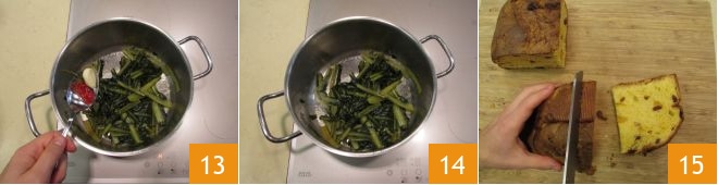 À la fin de la cuisson, retirez l'ail et le piment 13 et laissez tiédir 14. Enfin, occupez-vous du panettone. Du panettone milanais, bas et large, obtenez 8 tranches épaisses d'environ 1,5 cm. Assemblez celles qui ont la même taille pour éviter des sandwichs disproportionnés 15.