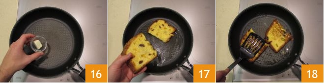 Chauffez bien une poêle antiadhésive, laissez fondre une noix de beurre 16 puis grillez les tranches de pain pendant environ une minute de chaque côté 17. Appuyez délicatement avec la spatule et répétez ainsi avec toutes les tranches 18.