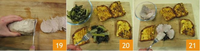 Maintenant que tous les ingrédients sont froids, tranchez le morceau de viande aussi finement que possible 19 : obtenez environ 3 – 4 tranches par sandwich, comptez environ 50 grammes par pièce. Passez à la composition. Sur une tranche de panettone grillé, disposez la chicorée catalognienne 20, la viande 21,