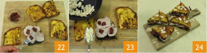 quelques tomates séchées à l'huile égouttées 22 et des lamelles d'amandes grillées à la poêle 23. Fermez avec la tranche de panettone similaire et répétez ainsi pour toutes. Voici vos sandwichs de panettone prêts, vous n'avez plus qu'à les déguster, si vous le souhaitez en les divisant en deux parties 24!
