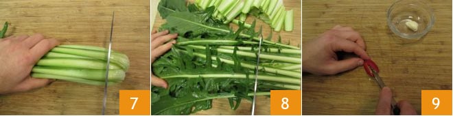 Entre-temps, occupez-vous de la chicorée catalognienne. Après avoir retiré la base 7, coupez-la en morceaux d'environ 10 cm puis rincez soigneusement 8. Ensuite, épluchez la gousse d'ail, incisez un piment et dirigez-vous vers les plaques de cuisson 9.