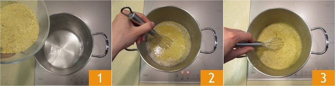 Pour réaliser le sandwich de polenta avec légumes et taleggio, commencez par préparer la polenta : versez la farine en pluie dans de l'eau salée bouillante 1, puis faites cuire selon les indications de l'emballage (environ 5 minutes) en remuant continuellement avec un fouet 2 jusqu'à ce qu'elle soit épaissie 3.