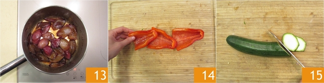 Une fois l'odeur de vinaigre disparue, les oignons sont prêts 13. Épluchez les légumes et coupez le poivron en quartiers 14 et la courgette en tranches obliques de 5 mm 15.