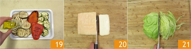 Assaisonnez les légumes avec de l'huile et du sel 19. Coupez le taleggio DOP en tranches épaisses de 8-9 mm 20. Coupez la salade en lanières 21.