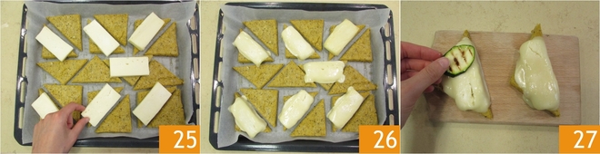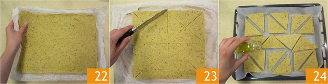 Récupérez la polenta raffermie, égalisez les bords et coupez la polenta en 4 grands carrés que vous diviserez ensuite, en coupant en diagonale, en 16 triangles 23. Disposez-les sur une plaque, arrosez-les d'un filet d'huile et de sel et faites cuire pendant 30 minutes dans un four statique à 200° 24.