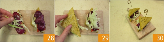 Enfin, ajoutez également la salade coupée à la julienne 28. Fermez avec une autre tranche de polenta 29 et fixez avec un bâtonnet en bois. Dégustez le sandwich de polenta avec légumes et taleggio tiède ou chaud 30.