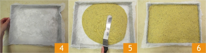 Couvrez une plaque de 30x40 avec du papier sulfurisé humidifié 4, versez la polenta et nivelez-la avec une spatule 5 6.