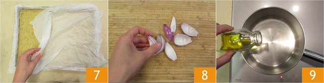 Recouvrez avec une autre feuille 7 puis laissez refroidir complètement au réfrigérateur pendant au moins 1 heure. Épluchez et coupez les oignons en quartiers 8. Dans une petite casserole à fond épais, chauffez un filet d'huile 9.