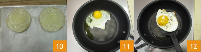 juste le temps que le fromage fonde. Si vous le souhaitez, vous pouvez également chauffer les deux moitiés supérieures des sandwiches 10. Vous aurez le temps nécessaire pour cuire les œufs au plat. Dans une poêle chaude avec un filet d'huile, cassez les œufs, vous pouvez utiliser une petite assiette ou un bol pour faire glisser les œufs, un à la fois, dans la poêle 11. Assaisonnez avec du sel et du poivre et lorsqu'ils auront atteint la cuisson que vous préférez, nous vous conseillons avec le jaune liquide, vous pouvez garnir les sandwiches 12.