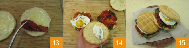 Sur les deux moitiés avec le fromage fondu, et récupérées du four, placez d'abord les poivrons 13, puis les œufs frits et étalez la crème à la crème aigre sur les deux autres moitiés (la partie supérieure des sandwiches, pour être clair) 14. Enfin, refermez et dégustez immédiatement vos sandwiches avec poivrons grillés et œufs 15.
