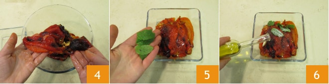 Une fois tiédis, il sera plus facile de les peler et d'éliminer les graines et les filaments à l'intérieur 4. Réduisez-les en filets, placez-les dans un bol et assaisonnez avec de l'ail, quelques feuilles de menthe 5, du sel, du poivre et de l'huile. Mélangez et réservez 6.