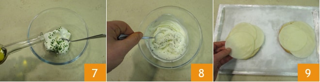 Entre-temps, préparez la sauce. Dans un bol, versez la crème aigre, émincez la ciboulette avec une paire de ciseaux et assaisonnez avec du sel, du poivre et de l'huile 7. Mélangez et mettez également de côté 8. Maintenant, placez les deux parties inférieures du sandwich sur une plaque avec du papier sulfurisé, ajoutez les tranches de fromage et mettez au four chaud pendant quelques minutes 9