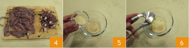 Une fois toutes les sardines nettoyées 4, occupez-vous de préparer la panure : versez dans un bol la chapelure, le fromage râpé 5 et la gousse d'ail écrasée 6.