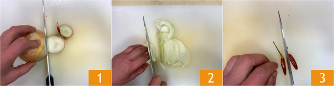 Pour préparer la sauce avec des côtelettes, commencez par nettoyer 1 et émincer finement l'oignon 2, puis coupez le piment en deux 3.