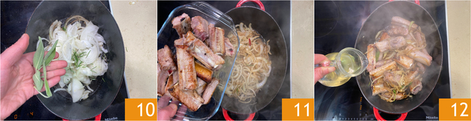 Ajoutez le romarin et la sauge 10 et laissez s'imprégner pendant environ 5 minutes avant d'ajouter les côtelettes dorées 11. Augmentez un peu le feu, en remuant souvent, et déglacez avec le vin blanc 12.
