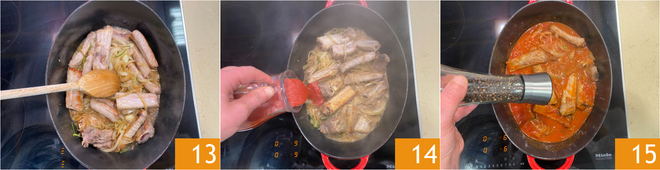 Laissez évaporer complètement la partie alcoolique 13, puis versez la purée de tomates 14 et assaisonnez de sel et de poivre 15.